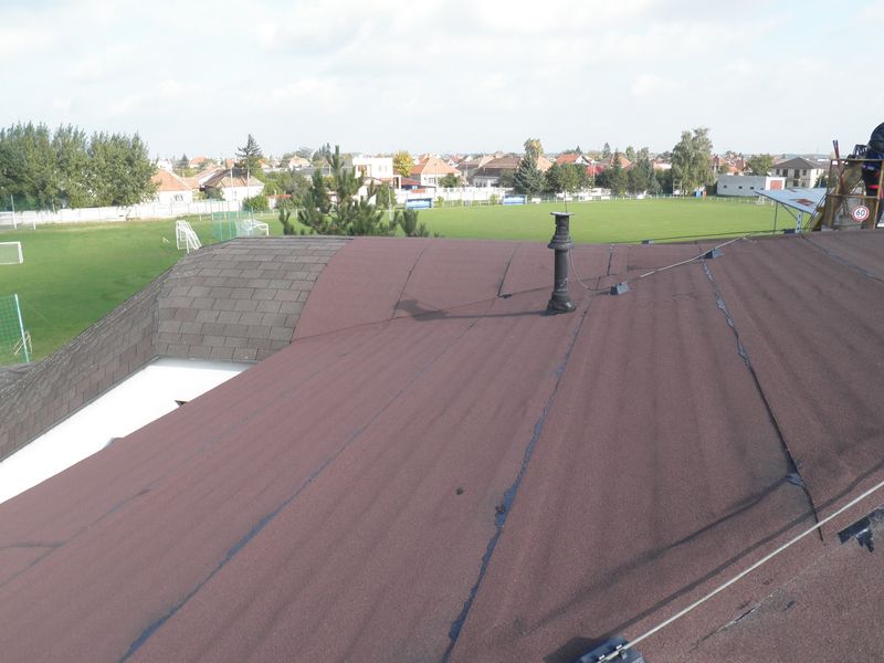 Rekonštrukciu vrchnej časti strešnej konštrukcie sa vykonala formou uloženia novej hydroizolačnej vrstvy z asfaltového pásu s posypom na jestvujúce asfaltové šindle.