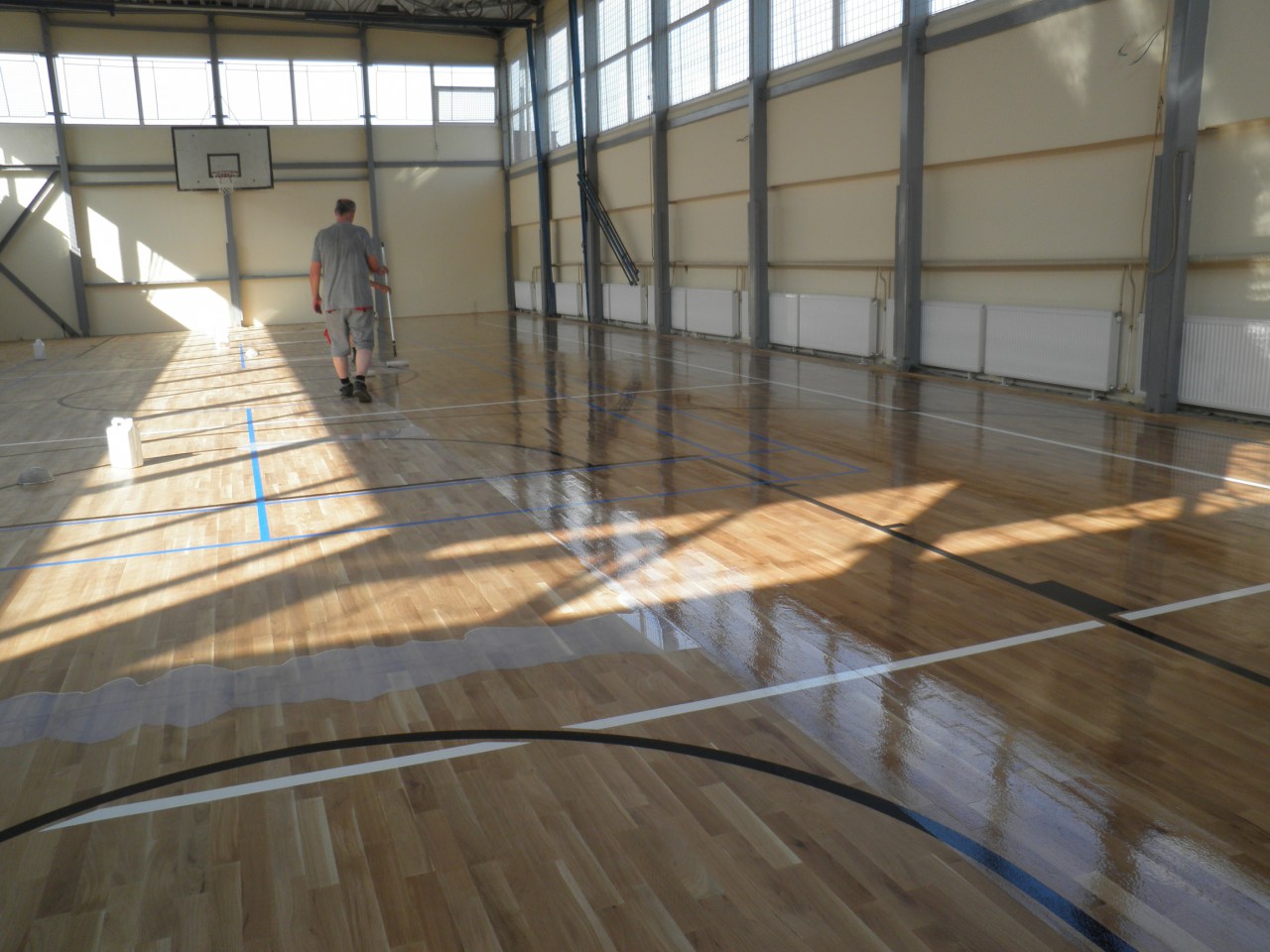 Obec Nesvady v zmysle schválenia finančných prostriedkov na rekonštrukciu cvičebného priestoru vyhlásila v mesiaci máj 2016 výzvu na predloženie cenovej ponuky na zákazku s nízkou honotou na uskutočnenie stavebných prác "Rekonštrukcia základnej školy Nesvady - Rekonštrukcia cvičebného priestoru". Predmetom zákazky bola kompletná výmena podlahovej konštrukcie vrátane izolácie veľkej telocvične základnej školy. Jestvujúca telocvičňa rozmerov 12,00 x 24,00 pozostáva z parketovej podlahy kotvenej do betónu. Stavebné práce pozostávali z odstránenia starej palubovky a podlahovej konštrukcie. Následne sa podklad vyčistil, vyspravil, vyrovnal a po penetrácii podkladu sa položila nová hydroizolácia. Vyhotovila sa nová podkladová konštrukcia palubovky ( drevený rošt). Osadila sa tepelná izolácia a na podkladovú konštrukciu sa položila spevnená podlaho z dosák. Osadila sa filtračná a spevnená geotextília, na ktorú sa položila vrchná vrstva palubovky. Tá pozostáva z dreveného masívu tvrdých parametrov o hrúbke 25 mm. Podlaha sa azbezpečila otvormi pre montáž volejbalovej konštrukcie. Palubovka sa natrela tvrdeným lakom určeným na interiérové palubovky v štyroch vrstvách. Vyhotovilo sa čiarovanie hrcích plôch, každé v inej farbe v zmysle štandardov s označením pre volejbal, bedminton a basketbal.